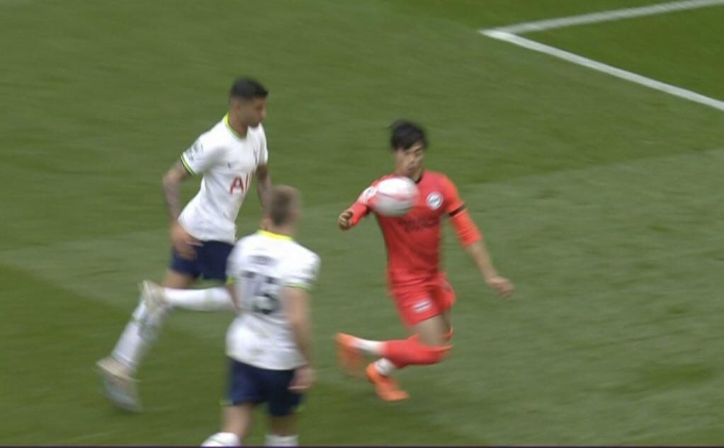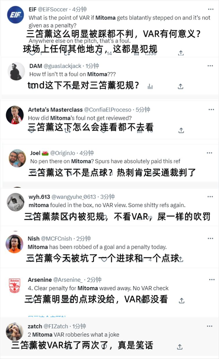 玩球网4月8日讯热刺vs布莱顿第71分钟,霍伊别尔禁区内踩到三笘薰的脚,裁判未做判罚,VAR也未介入。比赛未完场时,三笘薰这一词条已经冲上推特英国区热榜第一。球迷讨论的被吹进球: