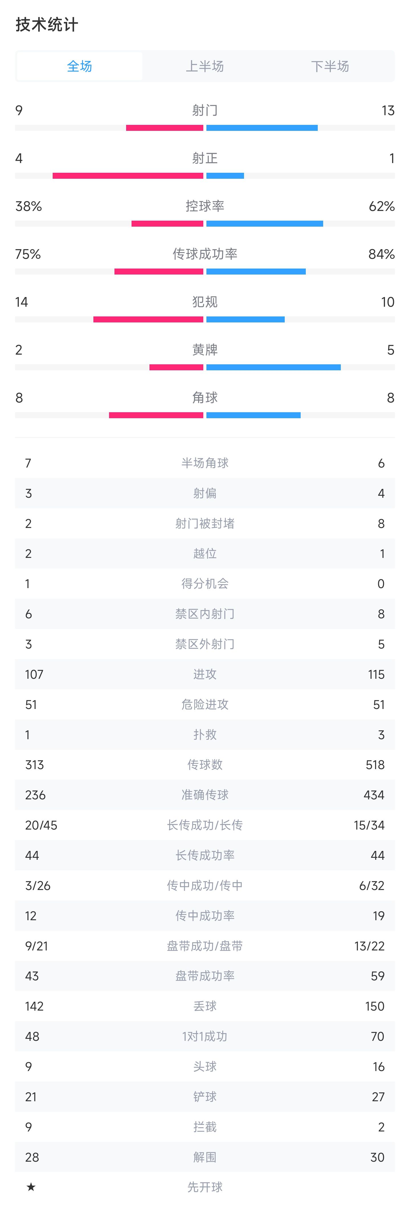 玩球网4月9日讯英超第30轮,切尔西客场0-1狼队,遭遇四轮不胜。全场数据如下(左-狼队右-切尔西):(夜神)