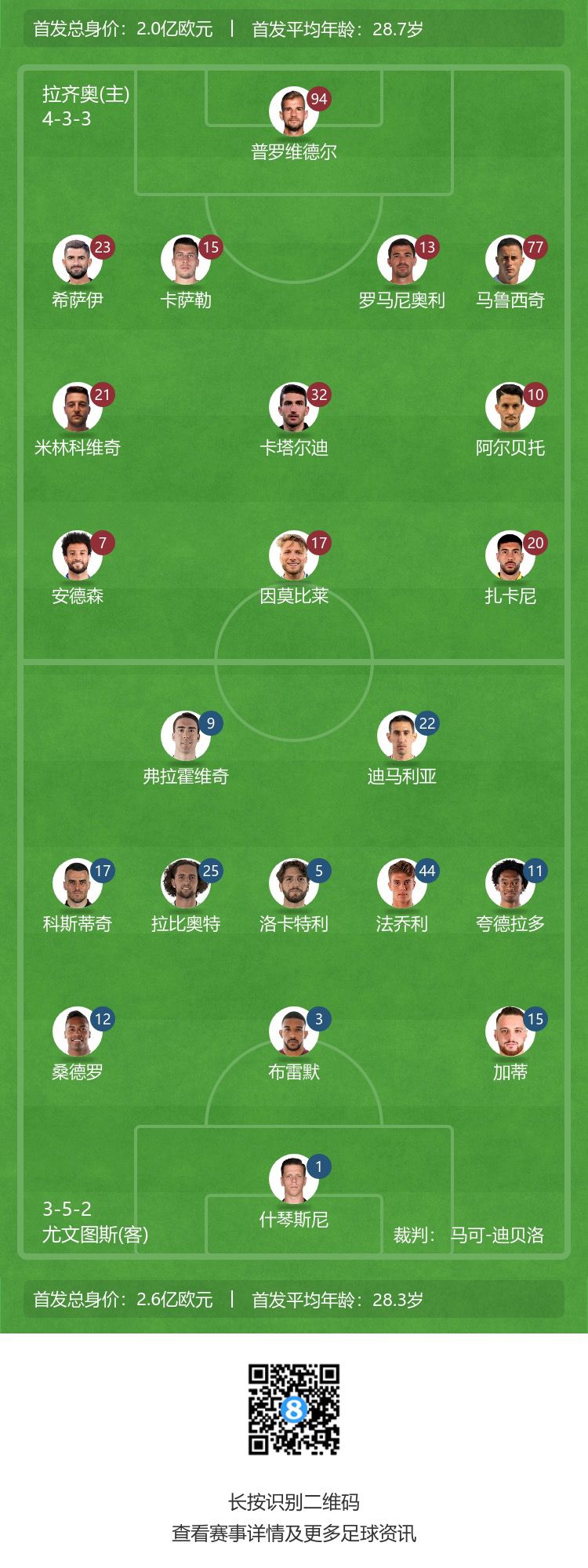 玩球网4月9日讯意甲第29轮焦点战,拉齐奥主场迎战尤文比赛即将打响。赛前首发出炉。拉齐奥首发:94-普罗维德尔、77-马鲁西奇、15-卡萨莱、13-罗马尼奥利、23-希萨伊、21-米林科维奇、32-卡