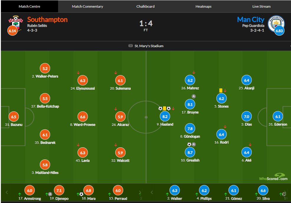 玩球网4月9日讯 在刚刚结束的英超联赛中,曼城客场4-1轻取圣徒。此役哈兰德双响8.2分,格拉利什传射8.7分全场最高,德布劳内8.1分。以下是详细评分: 曼城:埃德森6.1、阿坎吉6.4、迪亚斯7.0、阿克6.4、罗德里6.4、斯通斯6.2、德布劳内8.1、马赫雷斯6.2、京多安7.8、格拉利什8.7、哈兰德8.2、沃克6.3、菲利普斯6.2、戈麦斯6.1、贝尔纳多席尔瓦6.6、阿尔瓦雷斯6.6 圣徒:巴祖努6.5、奈尔斯5.8、贝德纳雷克6.1、科特查普5.5、彼得斯6.2、埃尔尤努西6.3、普劳斯6.6、拉维亚6.3、阿尔卡拉斯5.9、沃尔科特5.9、苏莱曼纳6.1、阿姆斯特朗6.0、杰内波7.1、马拉6.8、佩罗6.0、迪亚洛6.1 |