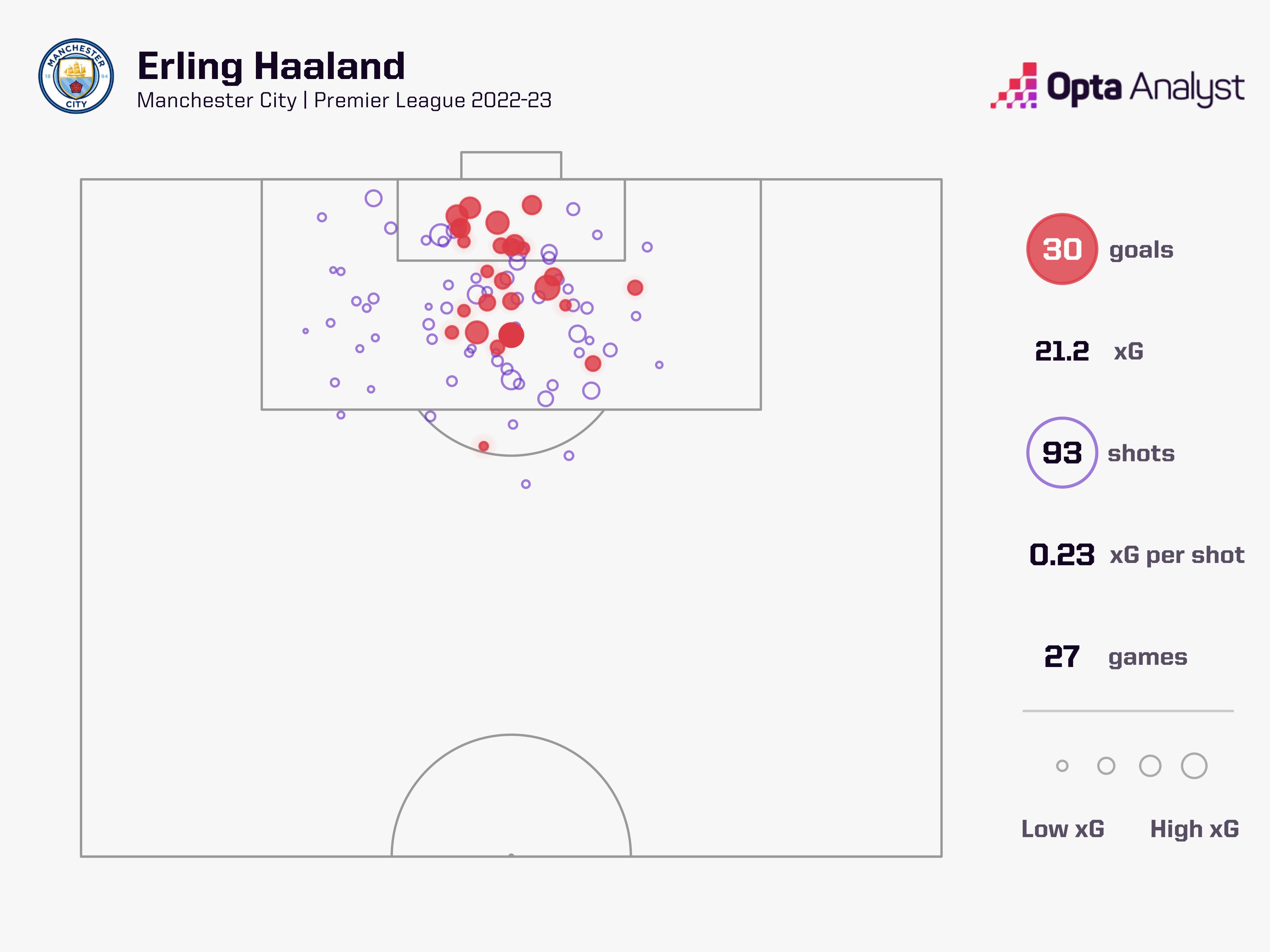 玩球网4月9日讯英超第30轮比赛,曼城在客场以4-1的比分大胜南安普顿,继续给榜首的阿森纳施加压力。本场比赛,曼城射手哈兰德梅开二度是球队取胜的大功臣,而他也解锁了一个小小的里程碑,因为这是他在英超中打进的第30粒进球。 根据OPTA的数据统计,哈兰德在英超中打进30球仅花费27场比赛。哈兰德打进英超30球仅需93脚射门,而他的预期进球数也只有21.2,这意味着每脚射门的预期进球数为0.23。 (二怪) |