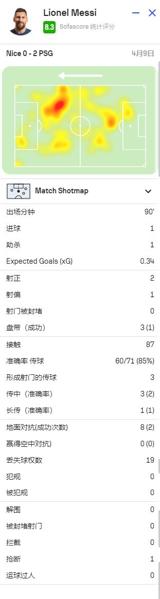 玩球网4月9日讯法甲第30轮,巴黎圣日耳曼2-0战胜尼斯。本场比赛梅西发挥出色,传射建功并且送出3次威胁传球。赛后sofasocore为他打出了8.3分的全场第二高分,仅次于多纳鲁马。详细数据如图↓梅