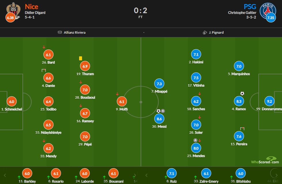 玩球网4月9日讯刚刚结束的法甲联赛,巴黎客场2-0战胜尼斯。赛后whoscored为本场球员打分,巴黎门将多纳鲁马7次扑救获得了全场最高的9.2分,梅西传射建功8.6分次席。以下是详细评分:尼斯:舒梅