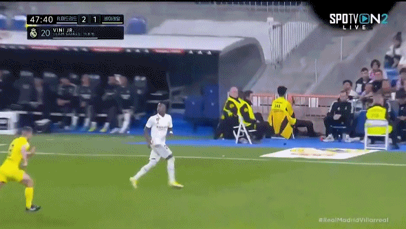 玩球网4月9日讯西甲第28轮,皇马2-3被黄潜逆转。比赛第46分钟,维尼修斯上演背部停球,1分钟后维尼修斯独闯龙潭杀穿黄潜防线推射破门。(夜神)