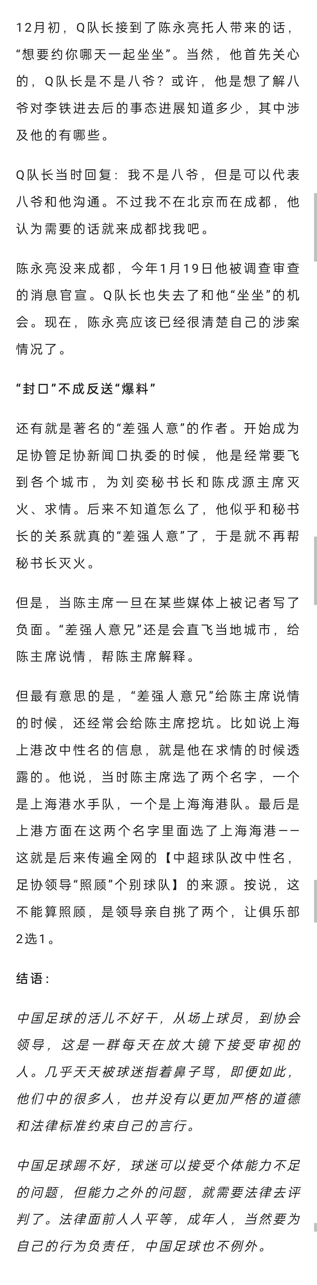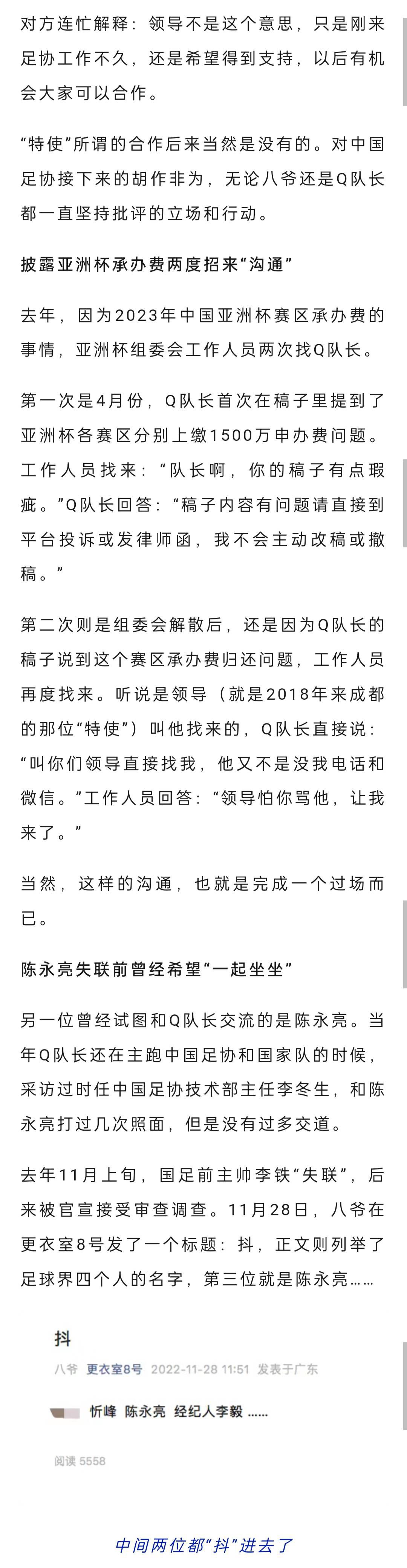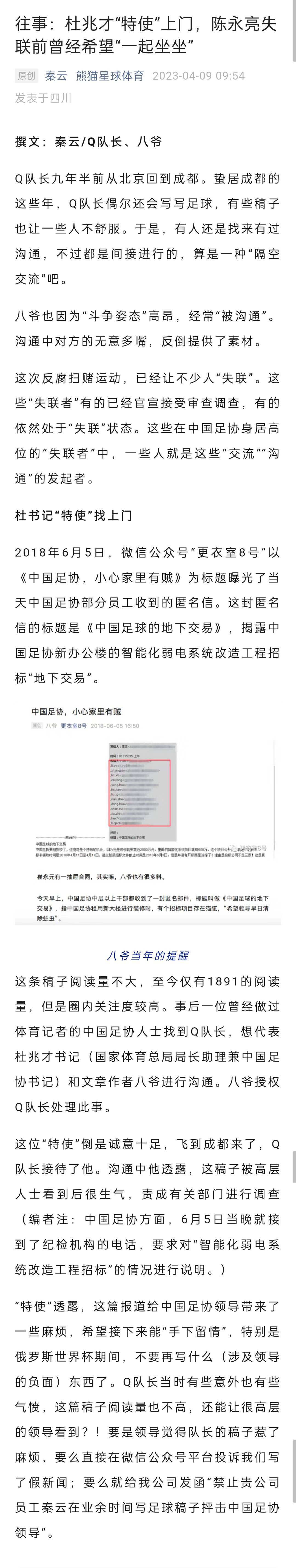 媒体人秦云再发文披露足协内部往事,表示曾因多次爆料足协事务招来“沟通”,其中就包括两次披露亚洲杯承办费,陈永亮失联之前还曾托人带话希望见面。【相关新闻】曝杜兆才涉亚洲杯赛区承办费:最低要1500万收款