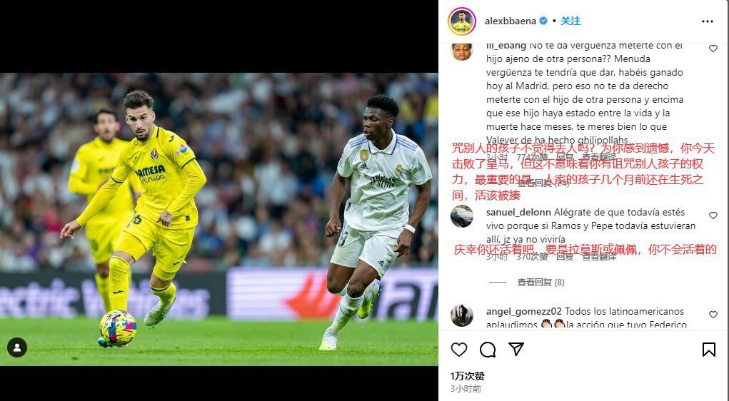 玩球网4月9日讯多家西媒报道,比利亚雷亚尔3-2击败皇马赛后,巴尔韦德在伯纳乌停车场打了黄潜球员巴埃纳。据媒体透露,巴埃纳在比赛中侮辱了巴尔韦德的孩子。不过,巴埃纳在社媒发文否认,大量球迷则在评论区为