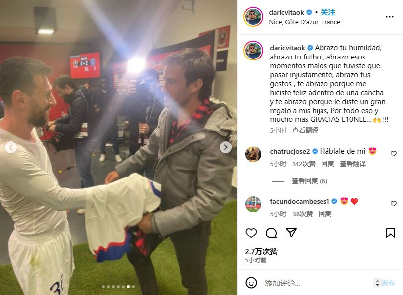 玩球网4月9日讯巴黎在今天凌晨的联赛2-0击败尼斯,赛后同为阿根廷人的尼斯名宿DarioCvitanich(达里奥-克维塔尼奇)获得了梅西的落场版球衣,他在赛后发文致敬梅西。“我拥抱你的热情,欣赏你的