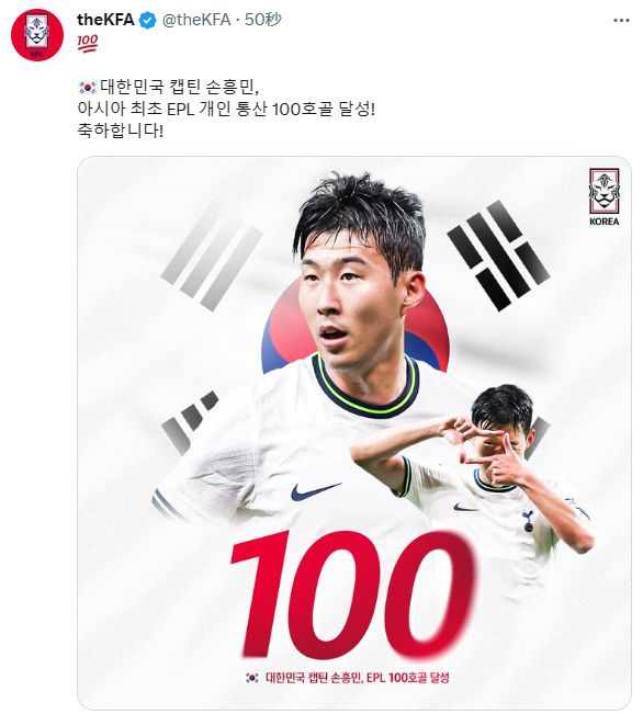 玩球网4月9日讯孙兴慜在英超第30轮比赛中远射破门,帮助热刺主场2比1击败布莱顿。这是孙兴慜在英超联赛中攻入的第100粒进球,韩国足协官方账号在社交媒体上晒出为孙兴慜制作的海报,祝贺他成为首位达成英超