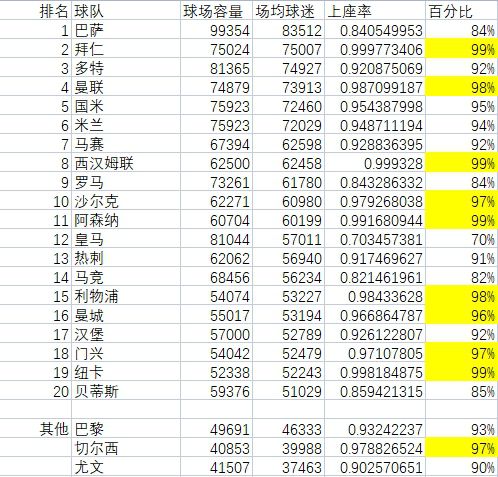 五大联赛进入最后的冲刺阶段,球队的成绩离不开球迷的支持。在各大球队本赛季主场的平均上座人数统计上,巴萨拜仁多特位列前三。而在上座率方面,英超德甲球队大部分均超过了95%。 具体数据如两图所示,数据来源为德转,因上座率为表格统计,排列所有球队工程较大,因此排序为上座人数排序。未进前二十的部分值得注意的球队也做了罗列。英超德甲球队单独罗列一部分,因为这两个联赛的大部分球队上座率都很高。 |
