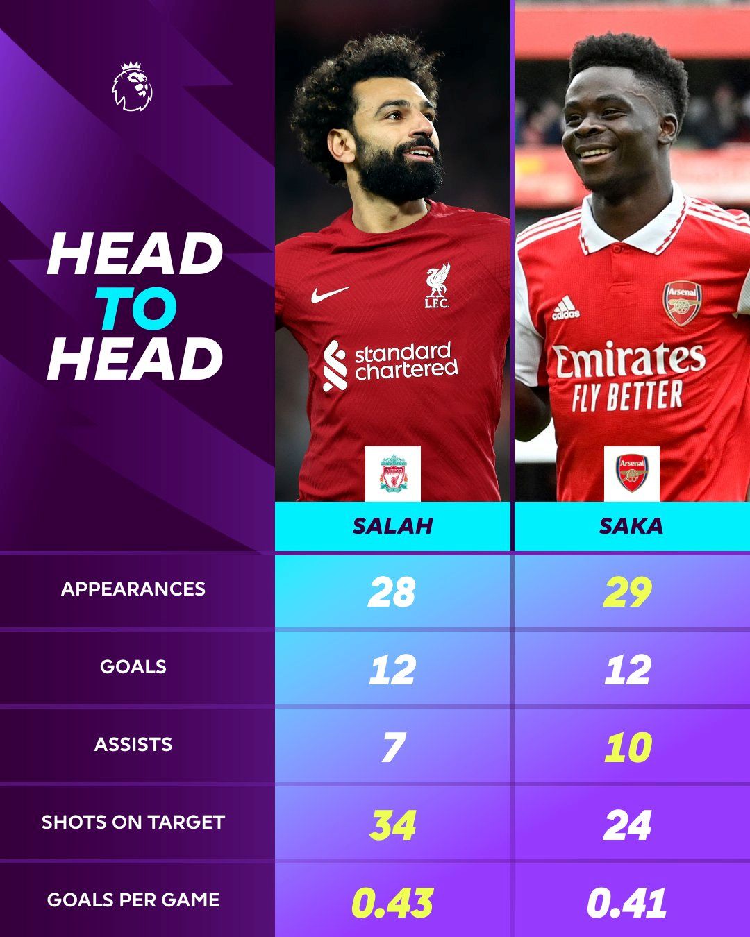 玩球网4月9日讯 北京时间今天晚上,利物浦将在英超第30轮比赛中主场对阵阿森纳。英超官方统计了萨拉赫和萨卡本赛季的数据,并作出对比。 萨拉赫vs萨卡本赛季英超数据(萨拉赫在前): 出场——28比29 进球——12比12 助攻——7比10 射正——34比24 场均进球——0.43比0.41 (木子) |