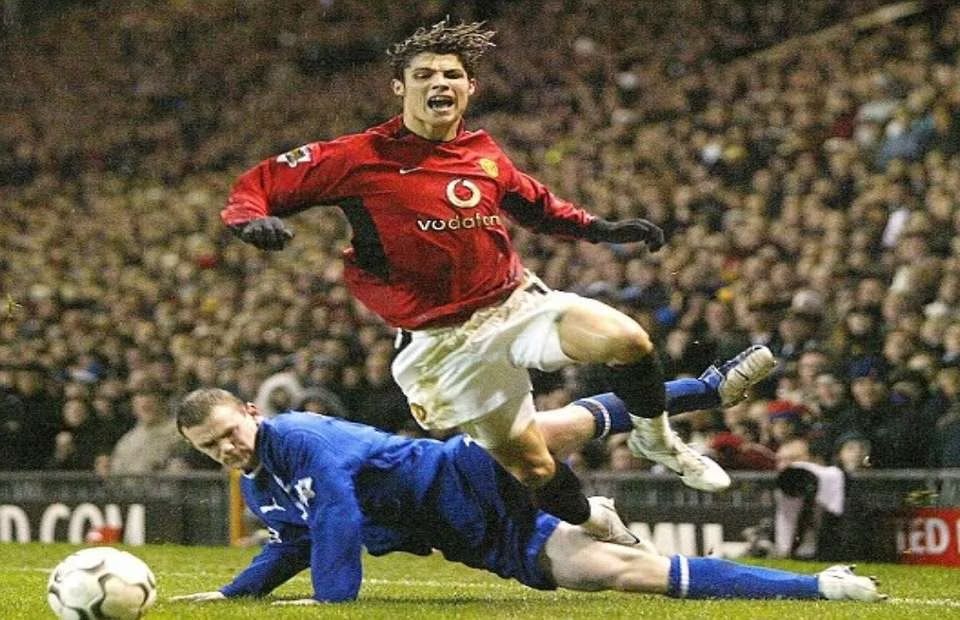 关注足球时光机,一起追忆经典,找寻青春!点击头像,查看更多足坛经典记忆03/04赛季英超第18轮,曼联主场3-2战胜埃弗顿,这是18岁的C罗与18岁的鲁尼第一次交手。比赛第58分钟,C罗边路拿球尝试突