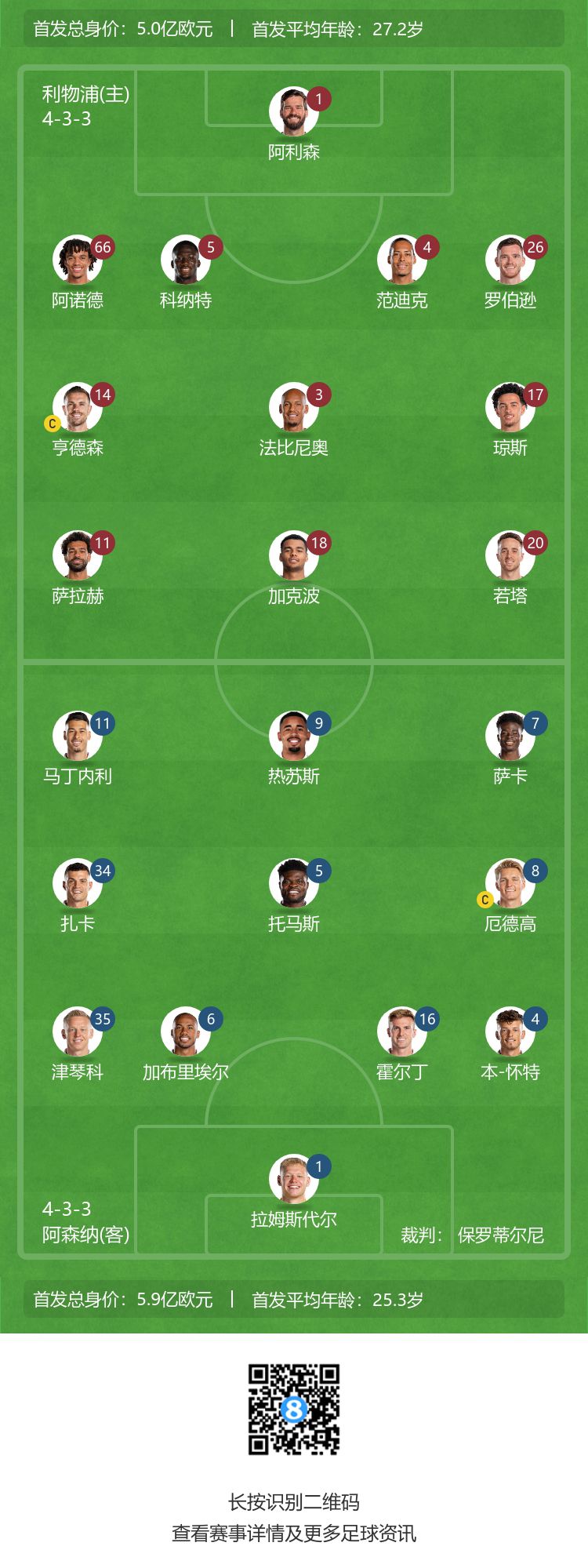 玩球网4月9日讯北京时间23点30分,英超第30轮迎来一场焦点战,利物浦坐镇安菲尔德迎战榜首的阿森纳。赛前双方首发已经公布!利物浦首发:1-阿利森、4-范迪克、5-科纳特、26-罗伯逊、66-阿诺德、