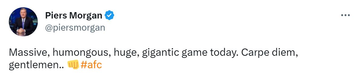 玩球网4月9日讯 北京时间23:30,英超第30轮阿森纳vs利物浦,著名枪迷皮尔斯-摩根难掩激动心情,晒出首发图,并用四个不同的单词表达“重大”。 摩根:今天有重大(massive),重大(humongous),重大(huge),重大(gigantic)的比赛。及时行乐,先生们…???? |