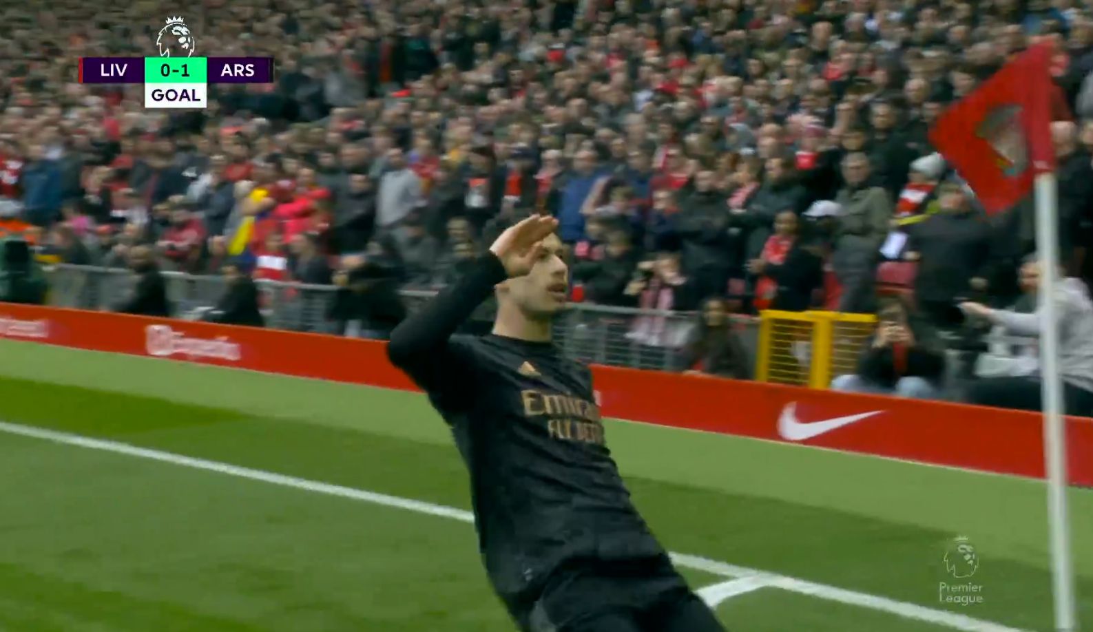 玩球网4月9日讯英超焦点战,利物浦对阵阿森纳,第8分钟,厄德高直塞被范迪克碰了一下,马丁内利领球杀入禁区捅射破门,阿森纳先入一球,1-0领先利物浦!