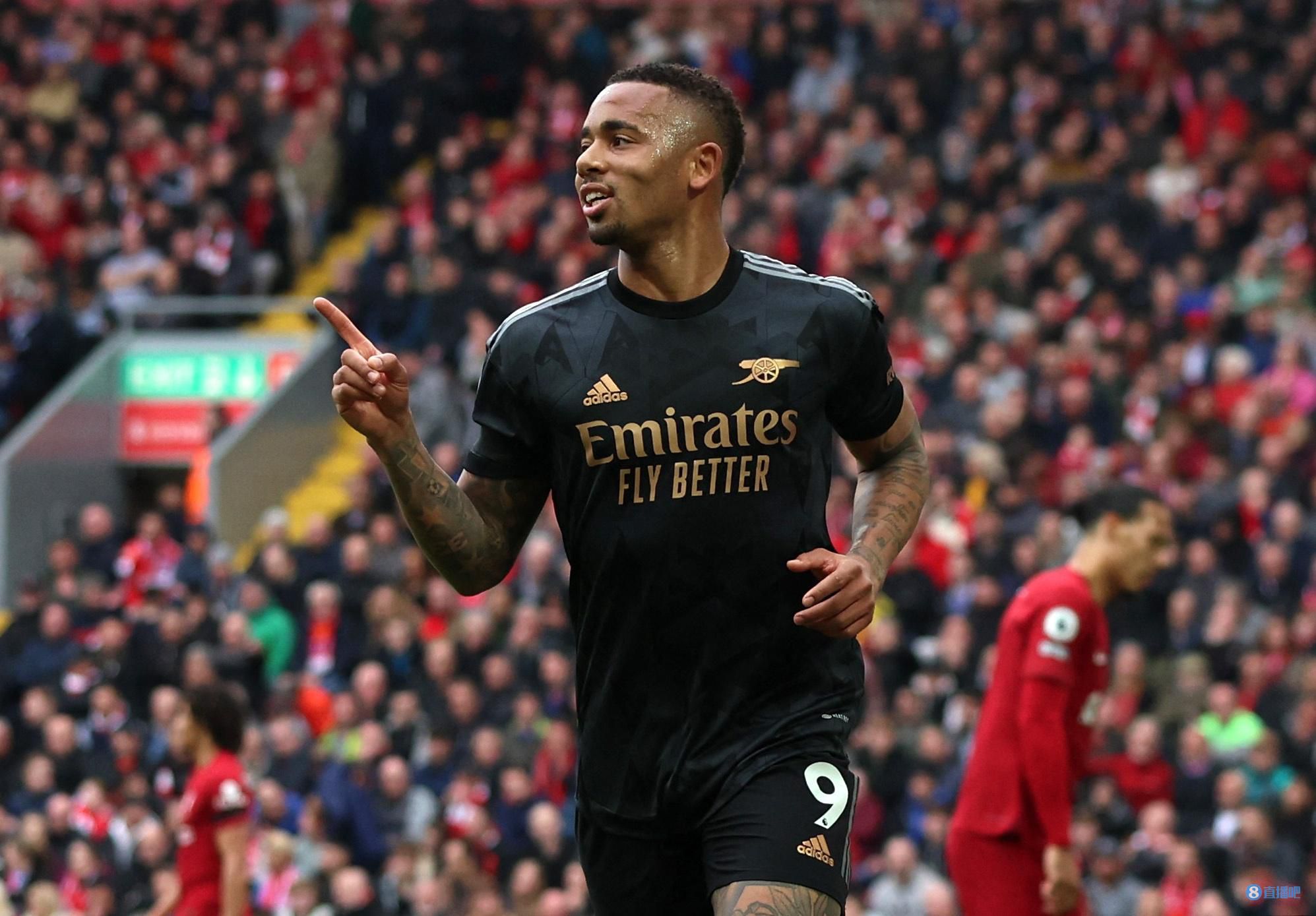 玩球网4月9日讯英超第30轮,利物浦vs阿森纳。第28分钟,马丁内利助攻热苏斯头球破门,帮助枪手2-0领先利物浦。进球后,热苏斯摇手指庆祝致敬大罗。