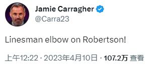 玩球网4月10日讯英超焦点战,利物浦主场2-2阿森纳。中场休息时,罗伯逊因抗议判罚被出示黄牌,现场视频显示,边裁抬肘打到罗伯逊下巴,之后罗伯逊一脸懵圈,摸着自己的下巴与萨拉赫交谈了几句。 后续>>罗伯逊遭边裁肘击,英超裁判公司声明:将进行全面审查 卡拉格也在社媒发文怒斥:“边裁肘击罗伯逊!” |