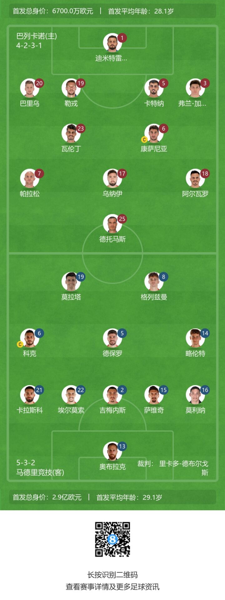玩球网4月10日讯西甲第28轮,马竞客战巴列卡诺。赛前,官方公布首发名单。马竞方面,格子搭档莫拉塔;巴列卡诺这边,德托马斯出战。马竞首发:13-奥布拉克、2-吉梅内斯、15-萨维奇、16-莫利纳、22