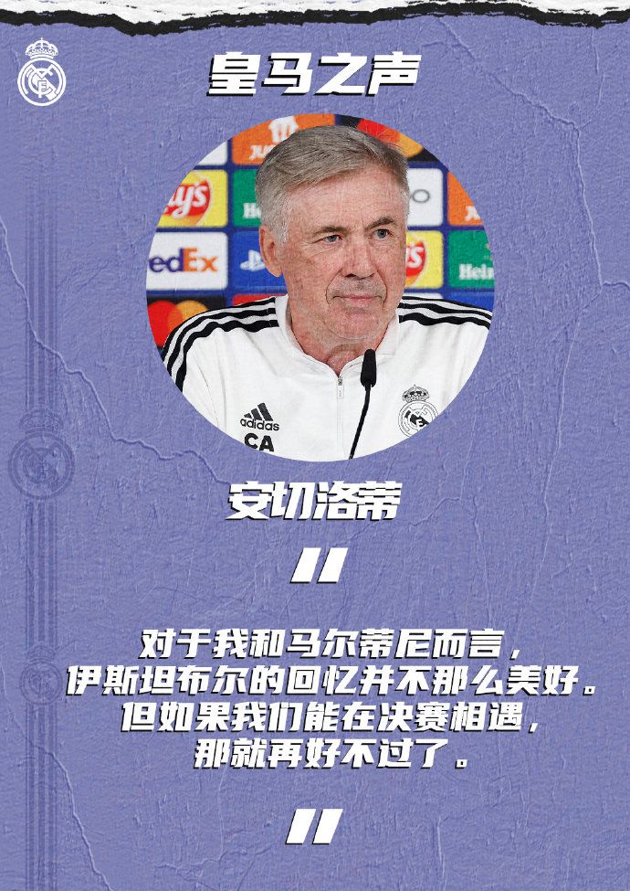 「比赛」首先要记得这是180分钟的较量,明天虽然不是决胜局,但赢球可以获得优势。目前球队状态很好,重返欧冠赛场大家斗志满满,期待又一个神奇的伯纳乌之夜。 「巴尔韦德」他斗志满满,训练状态出色。我非常了解他,他有着特别的、卓越的品质。多的我不想评价,他明天会全力以赴。 「加强进攻」我们非常专注,期待踢出一场精彩的比赛。大家要提升防守端的表现,而进攻端则要拿出对阵巴萨时的表现。 「再遇切尔西」上赛季的对决并不容易,对方给我们制造了压力,我们要尊重切尔西,他们有着出色的球员,即使最近不在最佳状态,但他们依然能制造威胁。他们是一支高水平球队。 「马尔蒂尼」对于我俩而言,伊斯坦布尔的回忆并不那么美好。我很爱马尔蒂尼,如果我们能在决赛相遇,那就再好不过了。 (皇家马德里足球俱乐部) |