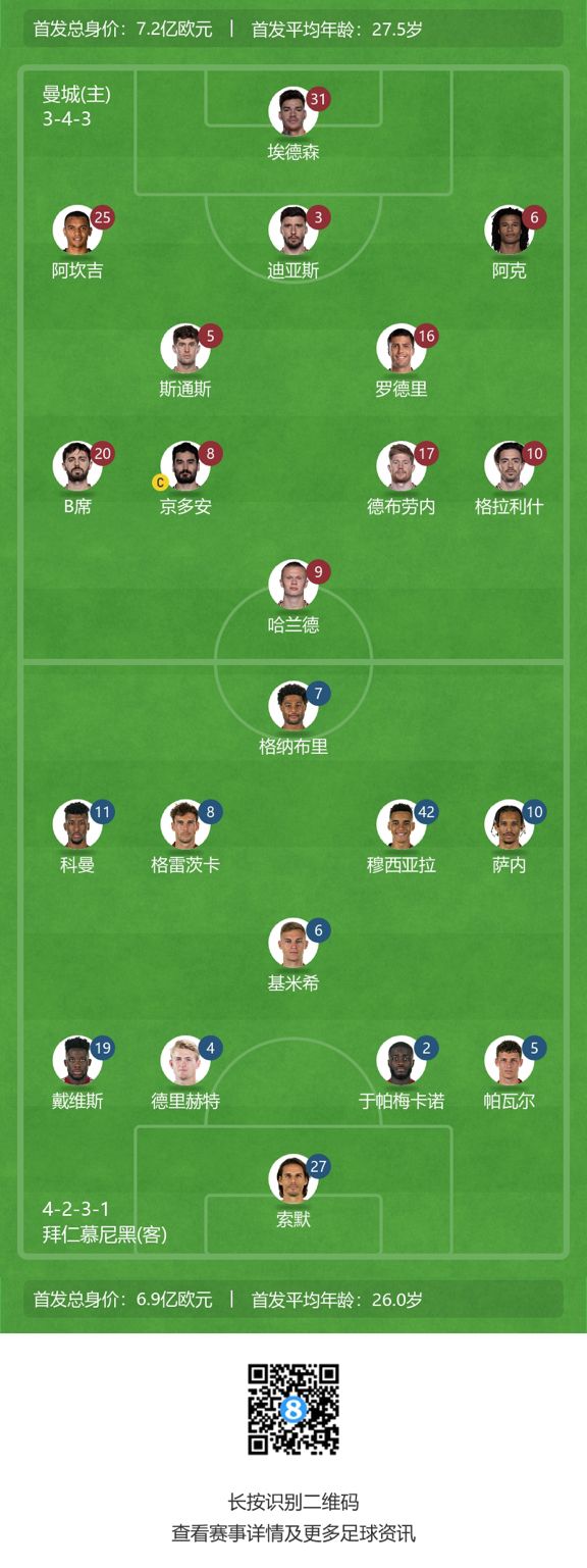 玩球网4月12日讯凌晨3点,欧冠1/4决赛首回合,曼城主场迎战拜仁慕尼黑,赛前首发名单公布。曼城首发:31-埃德森、3-鲁本-迪亚斯、25-阿坎吉、6-阿克、5-斯通斯、16-罗德里、8-京多安、17