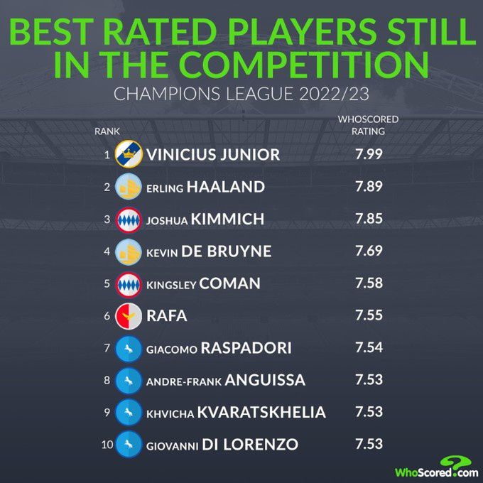 玩球网4月12日讯欧冠八强战即将战火重燃,whoscored也统计了仍未出局球员本赛季欧冠场均评分情况。whoscored列当前欧冠球员评分榜:1.维尼修斯(皇马),7.99分2.哈兰德(曼城),7.