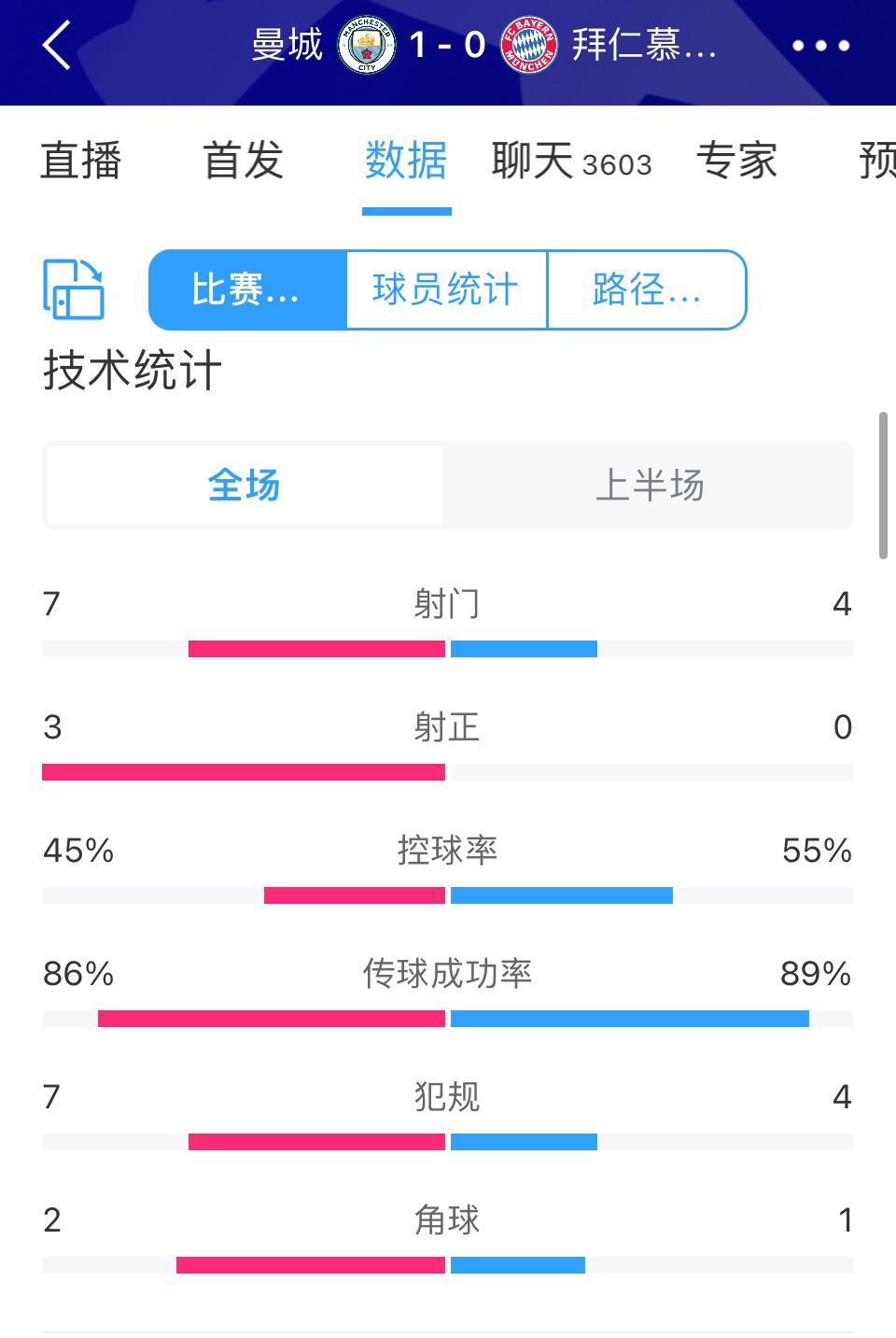 玩球网4月12日讯欧冠1/4决赛首回合,曼城主场迎战拜仁慕尼黑,目前曼城1-0领先,双方半场数据如图。