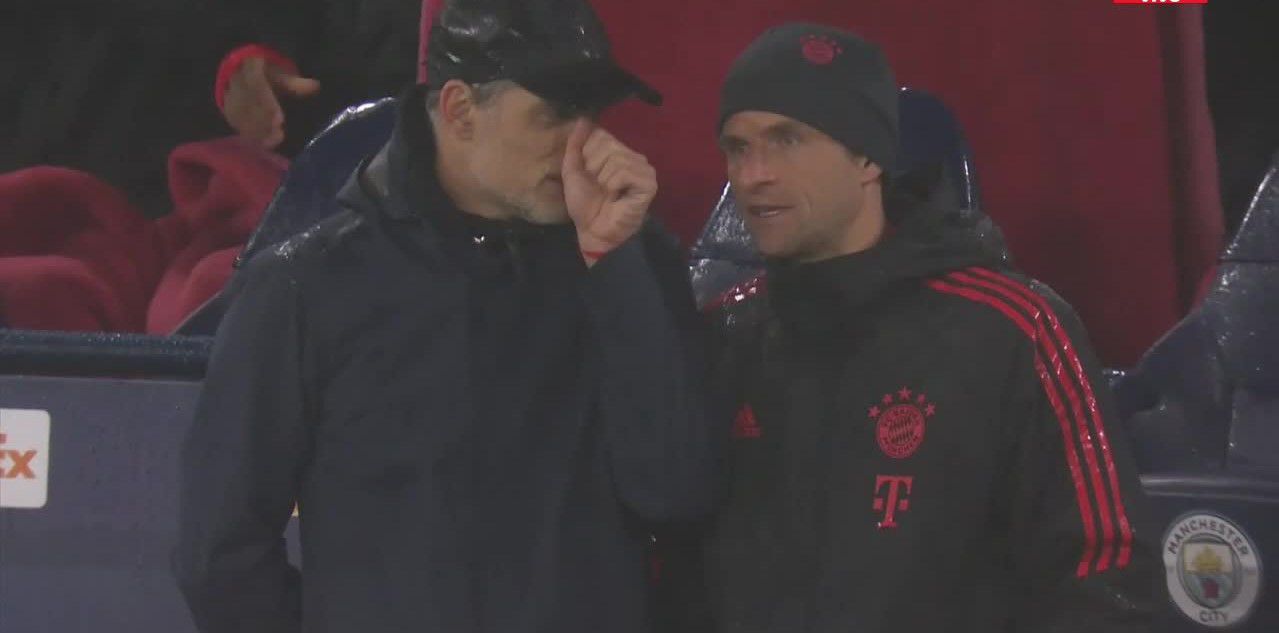 曼城vs拜仁,场边图赫尔与穆勒交流。