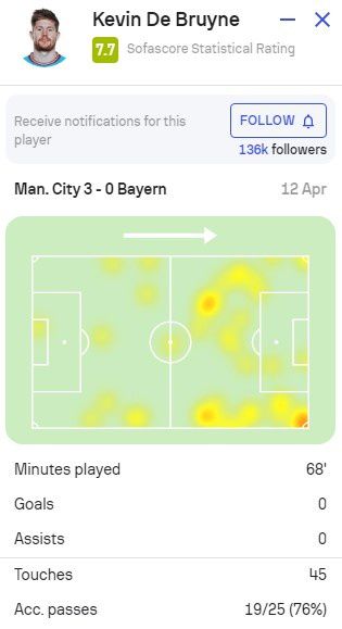 玩球网4月12日讯今天凌晨,曼城在欧冠中3-0击败拜仁,以下为德布劳内本场比赛的数据。此役,德布劳内首发并踢了68分钟,比赛期间他有45脚触球,25次传球19次成功,成功率76%,送出3次关键传球,1