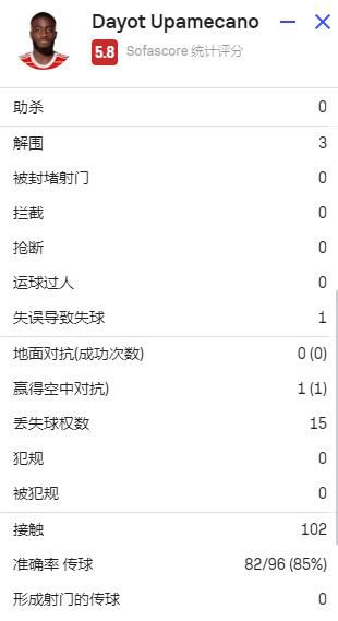 玩球网4月12日讯欧冠1/4决赛首回合,拜仁客场0-3不敌曼城,于帕梅卡诺多次出现失误,在Sofascore获评5.8分,全场只比阿方索高。于帕梅卡诺全场数据:失误致丢球:1次丢失球权:15次触球:1