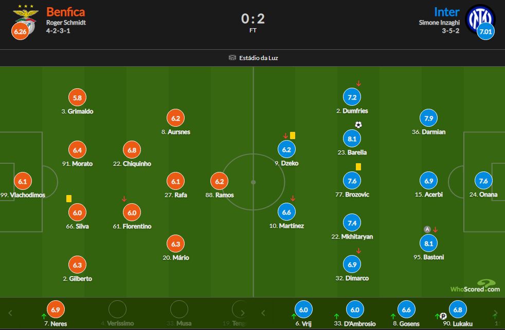 玩球网4月12日讯在刚刚结束的一场欧冠1/4决赛首回合比赛里,国际米兰客场2-0战胜本菲卡占得晋级先机。在whoscored的赛后评分里,此役送出助攻的巴斯托尼和打入本场比赛国米第一球的巴雷拉,同获8