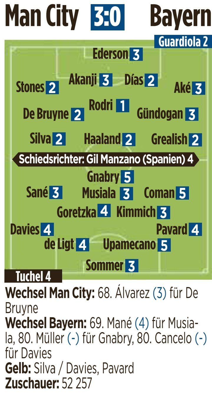 玩球网4月12日讯在北京时间今天凌晨进行的欧冠1/4决赛首回合比赛中,曼城主场3比0完胜拜仁,赛后德国媒体《图片报》为两队球员和主帅评分,罗德里1分最高,格纳布里、于帕梅卡诺、科曼5分全场最低。曼城v