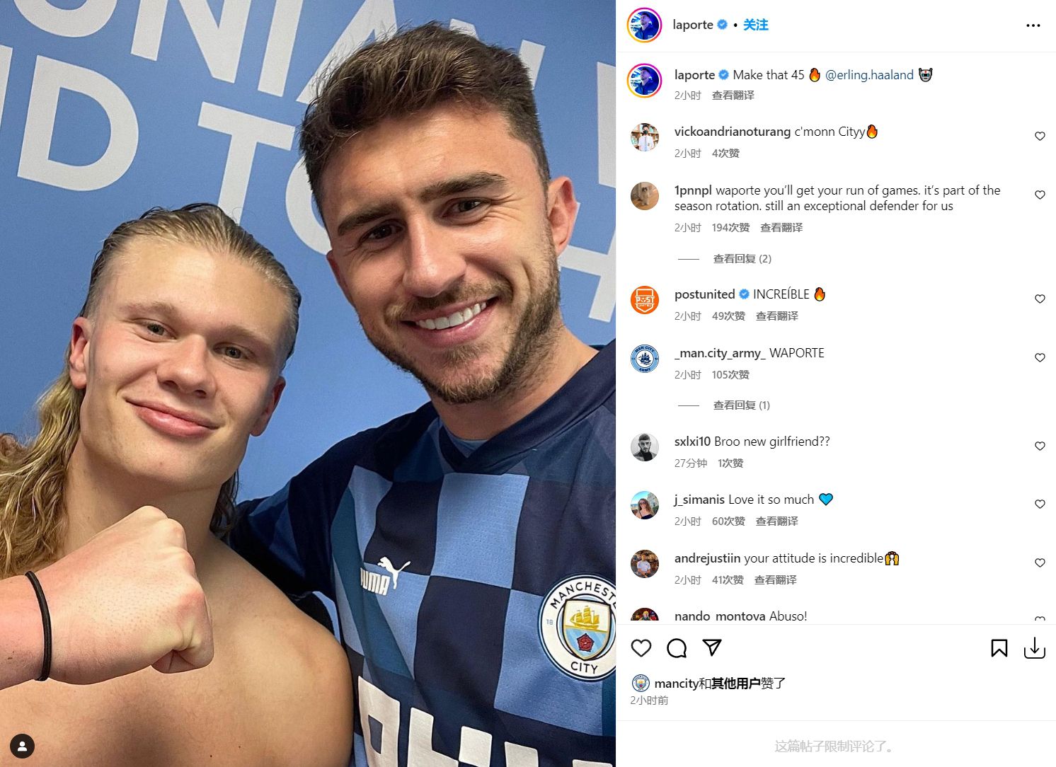 玩球网4月12日讯在北京时间今天凌晨进行的欧冠1/4决赛首回合比赛中,曼城3比0完胜拜仁,赛后曼城后卫拉波尔特在社交媒体上庆祝胜利。此役拉波尔特替补未出场,他在社交媒体上晒出与哈兰德的合照,并写道:“