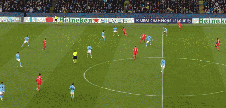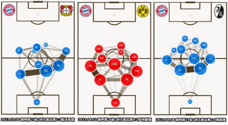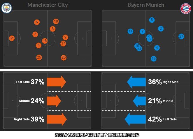 欧冠最佳防线以令人猝不及防的方式崩溃,拜仁慕尼黑兵败伊蒂哈德,淘汰赛之路荆棘丛生。两翼攻势遭到遏制,门前机会把握能力不佳,失去中锋庇佑的拜仁前锋群找不到感觉,压力回流到中后场,基米希在四处救火的过程中疲于奔命,于帕梅卡诺的崩溃不是一人之错,德甲巨人再次为关键球员在重要比赛中的伤停付出了沉重代价。 【年轻球员担责,中锋大坑难填】 德甲十连冠期间,拜仁在欧冠中的表现起伏很大,因锋线主将伤停而出局的经历不胜枚举。2014/15赛季,莱万多夫斯基受伤后戴面具迎战巴萨,2016/17赛季,波兰中锋又缺席对阵皇马的比赛(最终由比达尔越俎代庖司职中锋),拜仁均遭遇失利。2020/21赛季,弗里克的球队原本有希望完成欧冠卫冕目标,可惜的是,莱万多夫斯基的膝盖伤势令他们梦碎巴黎。舒波-莫廷的咖位无法与莱万多夫斯基相提并论,战术价值却不容低估,以萨内和穆西亚拉为首的二线攻击手离不开他的庇护。 过去几年,莱万多夫斯基的三次伤停都直接导致了拜仁的欧冠出局。此役是舒波-莫廷缺阵,拜仁再次体会到了主力中锋缺阵的痛苦。 较之上周末对阵弗赖堡的联赛,图赫尔对拜仁的主力阵容做出了三处调整,帕瓦尔、格雷茨卡和科曼回归首发。失去了中锋的支点效应,对手又是移动和对抗能力出众的英超球队,图赫尔雪藏了老将马内和托马斯-穆勒,希望多名持球能力很强的年轻攻击手以流动性配合冲击对手,减轻后场球员的压力。可惜的是,萨内和科曼未能从阿坎吉和阿克的防区打开缺口,阿方索-戴维斯又被伯纳多-席尔瓦限制,两翼失势导致整体战术崩塌。 【高位压迫失去效率,阵地进攻脱离轨道】 使用4231阵型踢出压迫感和侵略性十足的足球,一直是拜仁在竞技层面的标签。范加尔为老东家打造的体系已沿用十年有余,海因克斯、瓜迪奥拉和弗里克皆循规蹈矩,纳格尔斯曼却一直希望为德甲巨人打上属于自己的烙印,最终为三中卫试验失败而埋单。 图赫尔带领拜仁重回熟悉的体系,但他在细节上的谋篇还不够严谨,仓促接手球队的弊端体现了出来。 图赫尔吸取了前任的教训,在四后卫防线基础上建构战术。面对联赛争冠对手多特蒙德,拜仁的表现还比较保守,激进的“高位逼抢”被“中位压迫”所取代,此举既能保留己方在对抗方面的优势,也能为攻坚效率一般的前锋群创造空间。当舒波-莫廷伤停时,图赫尔认为拜仁应该更进一步,通过加强逼抢将发动进攻的地点向前推移,避免落入阵地战的泥潭。 拜仁的高位压迫效果一般,被迫落入阵地战的泥潭。 格拉利什和伯纳多-席尔瓦来到后场接球撑起“宽度”,斯通斯在后腰和后卫之间自如切换,罗德里与京多安、德布劳内组成兼顾小球和长传的中场三人组,鲁本-迪亚斯可以用斜长传直接放飞边锋……曼城球员摆脱了位置的束缚,瓜迪奥拉构建了立体化的出球网络,拜仁试图从斯通斯和阿坎吉的防区打开缺口,效果并不好,只能硬着头皮进入阵地战阶段。 【两翼尽折出人意料,疯狂远射无功而返】 弗里克时代后期,拜仁中场控制力不足的问题已经暴露,纳格尔斯曼试图依靠三中卫体系来解决这个问题,效果一般。面对巴塞罗那和巴黎圣日耳曼的进攻压制,拜仁依靠阿方索-戴维斯与锋线取得联系,纳格尔斯曼创造性地将马兹拉维改造为边后腰,减轻了基米希和格雷茨卡的压力。 科曼无法突破阿克,萨内的内切通道被伯纳多-席尔瓦和罗德里卡住,阿方索-戴维斯被伯纳多-席尔瓦限制,拜仁两翼尽折。 图赫尔看重帕瓦尔的对抗能力,马兹拉维只能在替补席上待命,推动进攻的重任落到了阿方索-戴维斯身上,瓜迪奥拉安排跑动能力极强的伯纳多-席尔瓦担任右边锋,摧毁了拜仁的制动后驱。阿方索-戴维斯无法在边路制造杀机,拜仁前后连接处于脱节状态,萨内和科曼要摆脱阿坎吉和阿克已经非常吃力,要突破曼城依靠442阵型对边肋部的封锁就更加困难,只能频繁尝试远射来赌赌运气。 下半场初段,拜仁在阵地进攻是很难攻入禁区,只能利用远射和定位球叩关。 萨内错失单刀机会,无视前插到空位的格雷茨卡,错失扳平良机。 弗里克时代套路在纳格尔斯曼时代几乎全部消失,高位接球的边锋成进攻发起点,边路传中成为主要进攻支援方式,前场站位拥挤且混乱,阵地战缺少层次感和变化。上赛季欧冠淘汰赛做客比利亚雷亚尔,拜仁进攻效率低下,甚至出现了格纳布里和舒波-莫廷替补出场后0触球的情况。纳格尔斯曼试图建立起高效的局部配合,图赫尔看重强弱侧的装换,这对边锋的大局观提出了很高的要求。下半场初段,萨内的几脚射门都很精彩,但他无视格雷茨卡频繁插上的举动,或许在无形中改变了比赛的走势。 【防线中坚突然崩溃,中锋救兵令人失望】 面对曼城的立体攻势,拜仁在防守中需要完成由4-4-2向5-4-1的切换,基米希沉入防线遏制后插上的攻击手,穆西亚拉顺势填补后腰位置的空缺。当曼城连续尝试边路传中时,拜仁的“五后卫”防线尚能顶住压力,基米希的经验起到了关键作用,而当罗德里出现在禁区弧顶参与攻坚时,年轻的穆西亚拉显然没有做好准备。 基米希担任“临时中卫”时是合格的,穆西亚拉扮演“后腰”时是不合格的。 进攻端无法持续消耗对手,压力积聚到了防线上。于帕梅卡诺连续犯错,这既是个人状态问题,也是体系崩塌的结果。 追分阶段依然无法深入禁区,图赫尔换上马内担任中锋,