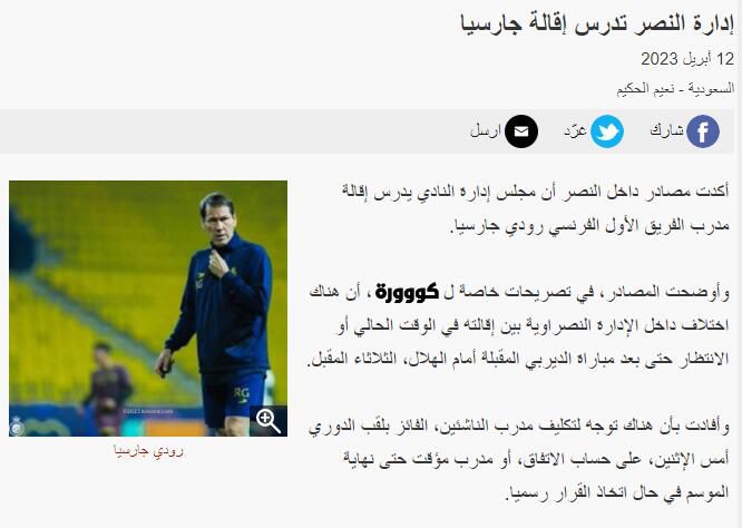 玩球网4月12日讯据多家沙特媒体报道,在上轮联赛0-0战平费哈后,利雅得胜利在积分榜上落后榜首3分,利雅得胜利高层正在考虑解雇主帅鲁迪-加西亚。沙特媒体称,在0-0战平费哈后,俱乐部高层和加西亚进行了