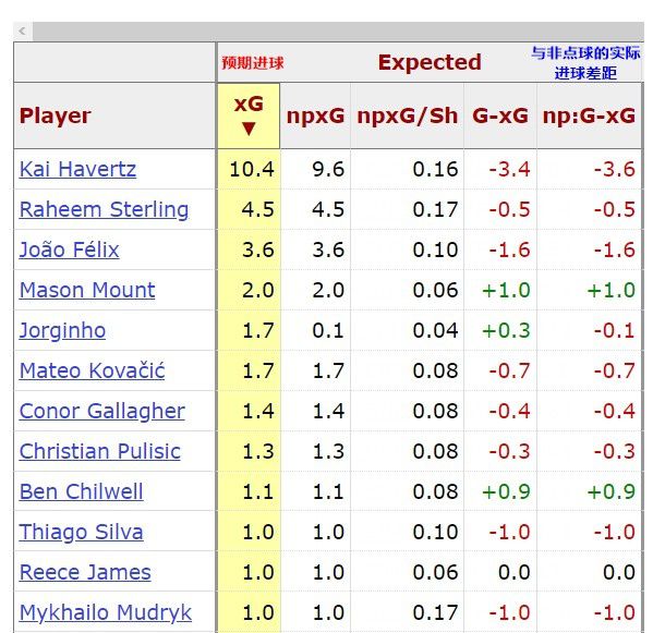 不过切尔西的最大痛点,还是谁能进球。从本赛季的统计数据可以看到,在英超预期进球超过1个的球员里,只有2名切尔西球员的非点球实际进球数,高于预期进球数。