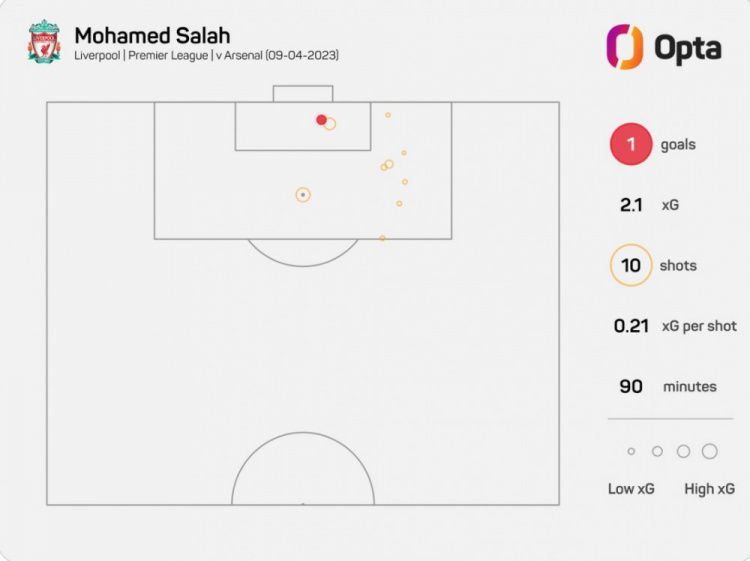 玩球网4月10日讯在英超第30轮比赛中,萨拉赫取得进球,帮助利物浦主场2比2战平阿森纳。据Opta统计,萨拉赫本场比赛射门10次,预计进球为2.1粒,而阿森纳全队射门9次,预期进球1.4粒。自2003