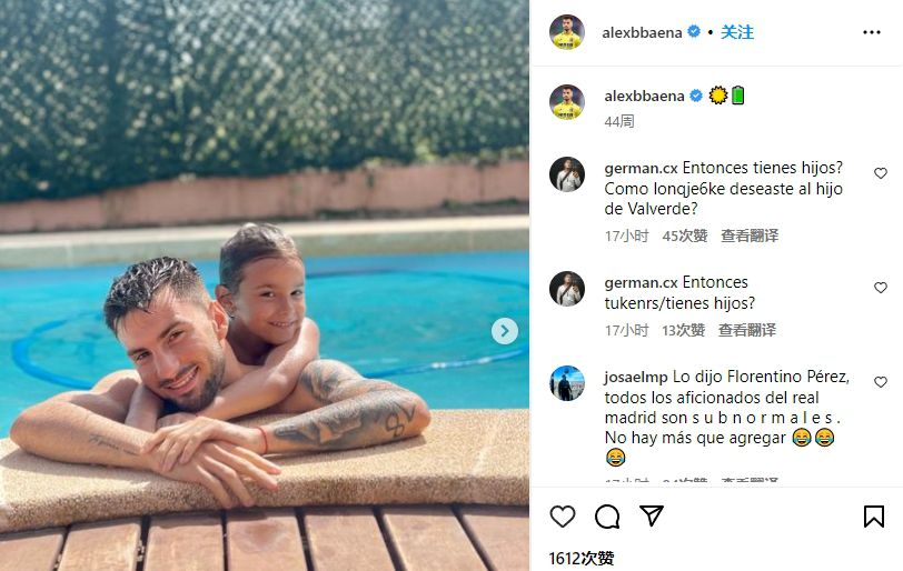 玩球网4月10日讯西班牙四台报道,皇马球迷和乌拉圭球迷冲爆了比利亚雷亚尔球员巴埃纳的Instagram,在他与一个小女孩的合影动态下辱骂他和他的家人。此前皇马输给比利亚雷亚尔后,有消息称巴尔韦德在停车