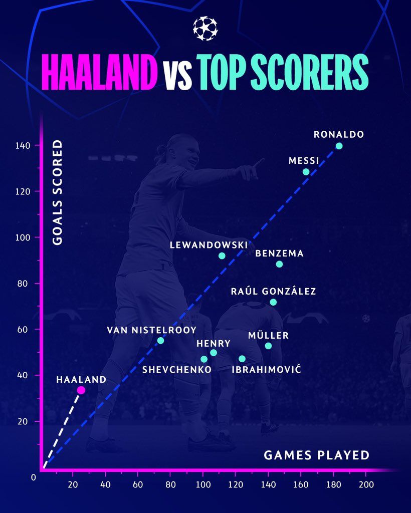 各大射手在欧冠历史进球榜的位置,横轴=场数,纵轴=进球数