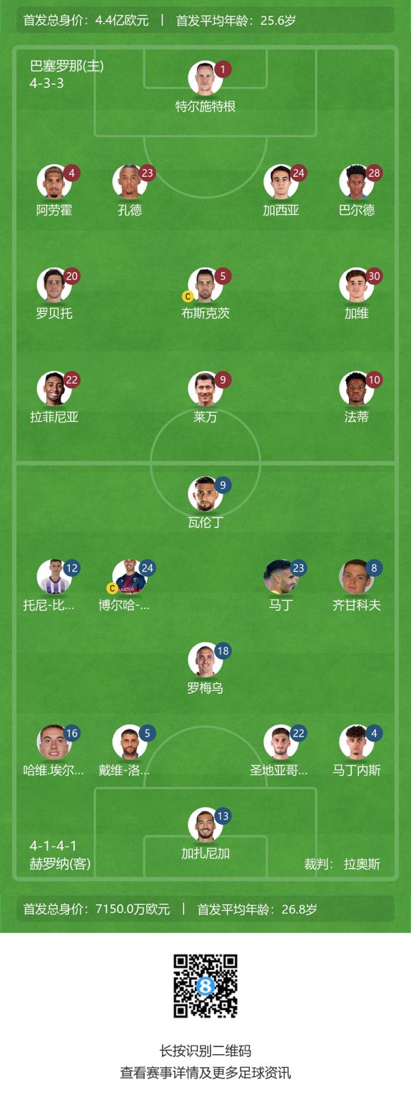 玩球网4月11日讯西甲第28轮巴塞罗那主场迎战赫罗纳,赛前首发名单公布。巴萨首发:1-特尔施特根、4-阿劳霍、23-孔德、24-埃里克-加西亚、28-巴尔德、5-布斯克茨、20-罗贝托、30-加维、1