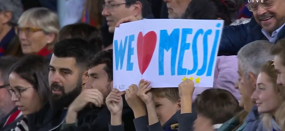 玩球网4月11日讯西甲第28轮,巴塞罗那主场迎战赫罗纳,比赛第10分钟,诺坎普现场的球迷都高喊梅西名字,还有球迷举起了写有我们爱梅西字样的标语。