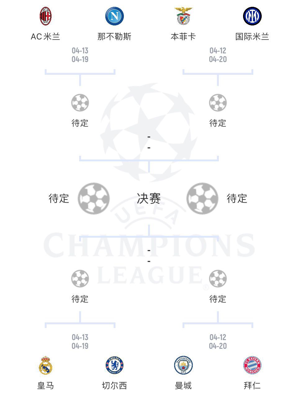 欧冠1/4决赛首回合比赛即将开打,明日凌晨3点将进行本菲卡vs国米、曼城vs拜仁的比赛,13日的凌晨3点将进行皇马vs切尔西、米兰vs那不勒斯的比赛。