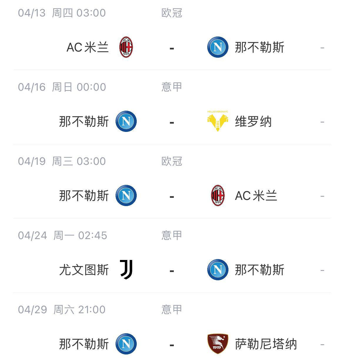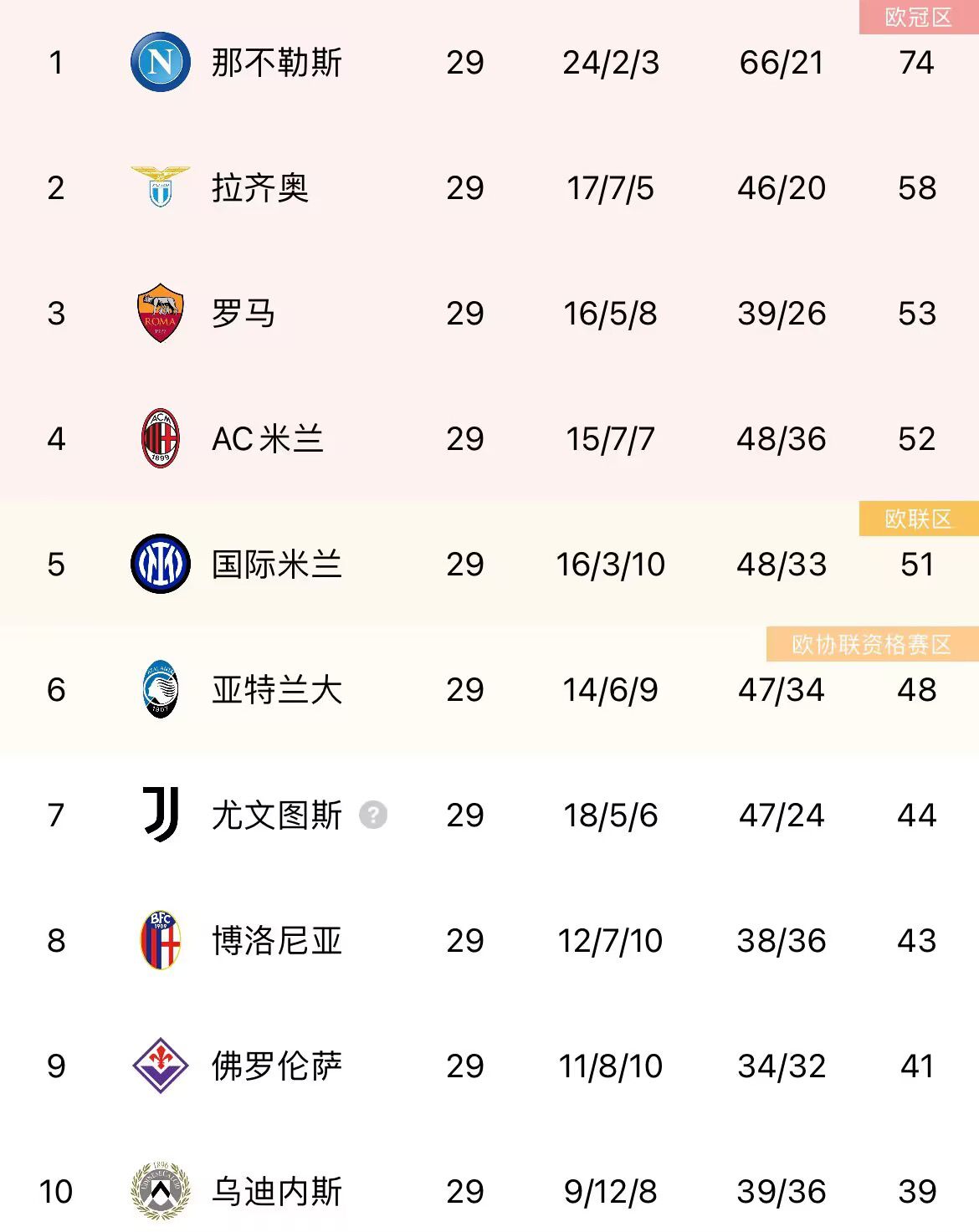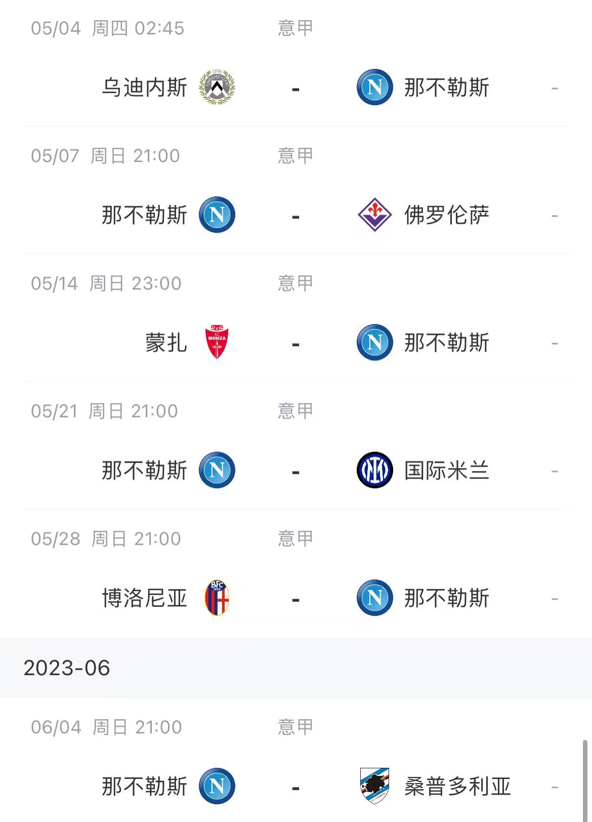 意甲已经进行到29轮,那不勒斯16分优势领跑,他们再赢下4场即可锁定意甲冠军。 意甲还剩9轮,那不勒斯目前以74分遥遥领先,第二的拉齐奥只有58分。还剩9轮领先16分,这意味着那不勒斯只要再赢得4场联赛,即可锁定意甲冠军。 那不勒斯剩余赛程: |