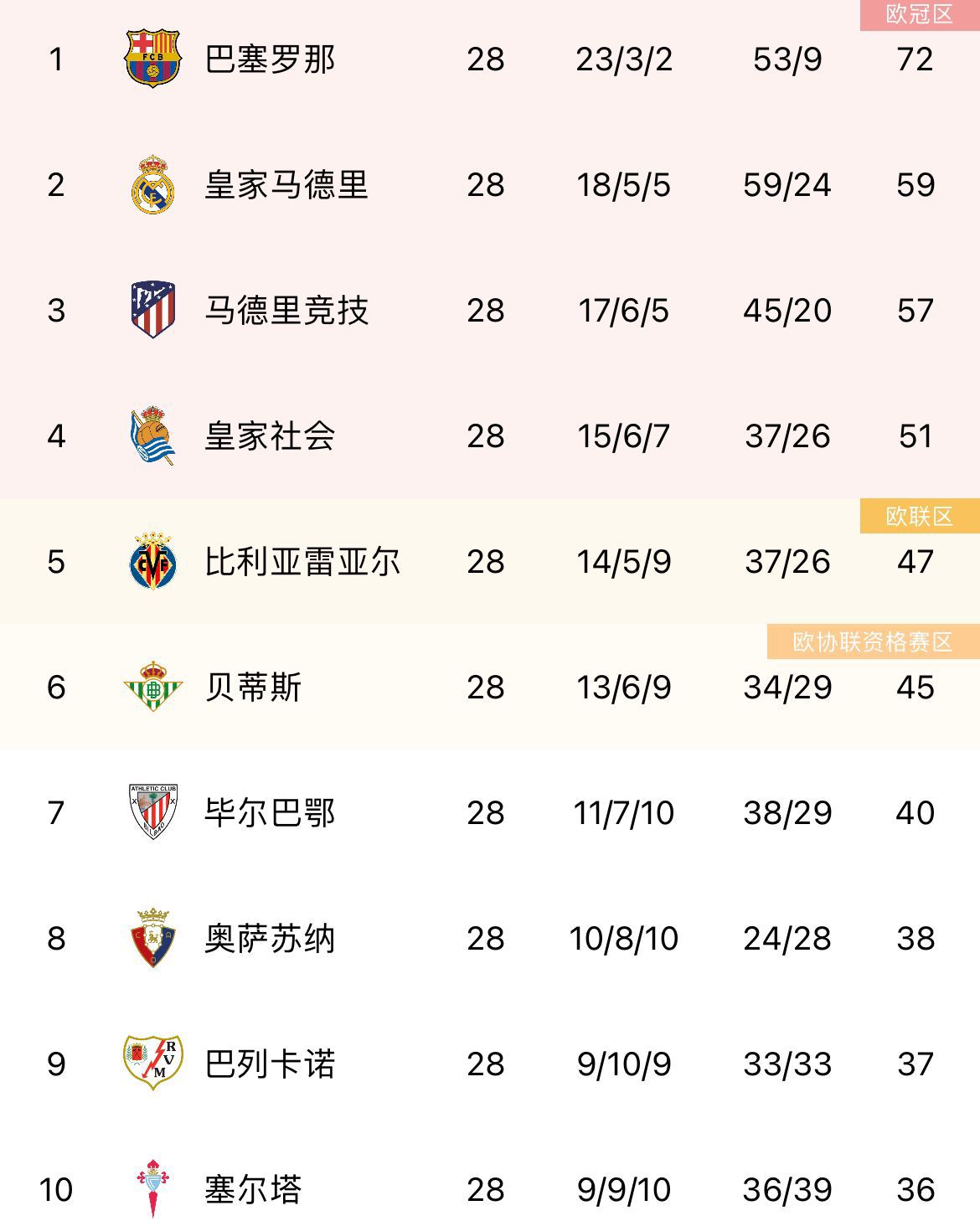 西甲已经进行到28轮,巴萨13分优势领跑,他们再赢6场联赛即可锁定冠军。巴萨目前以72分排在第一,第二的皇马只有59分。本赛季两场直接对决中,巴萨客场1-3、主场2-1皇马,相互战绩处于劣势。因此,在