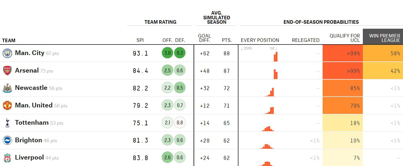 玩球网4月11日讯大数据机构fivethirtyeight更新了对英超争冠结果的预测,在阿森纳2-2战平利物浦后,曼城的夺冠几率反超阿森纳。目前的预测结果,曼城的夺冠概率达到了58%,阿森纳的夺冠概率