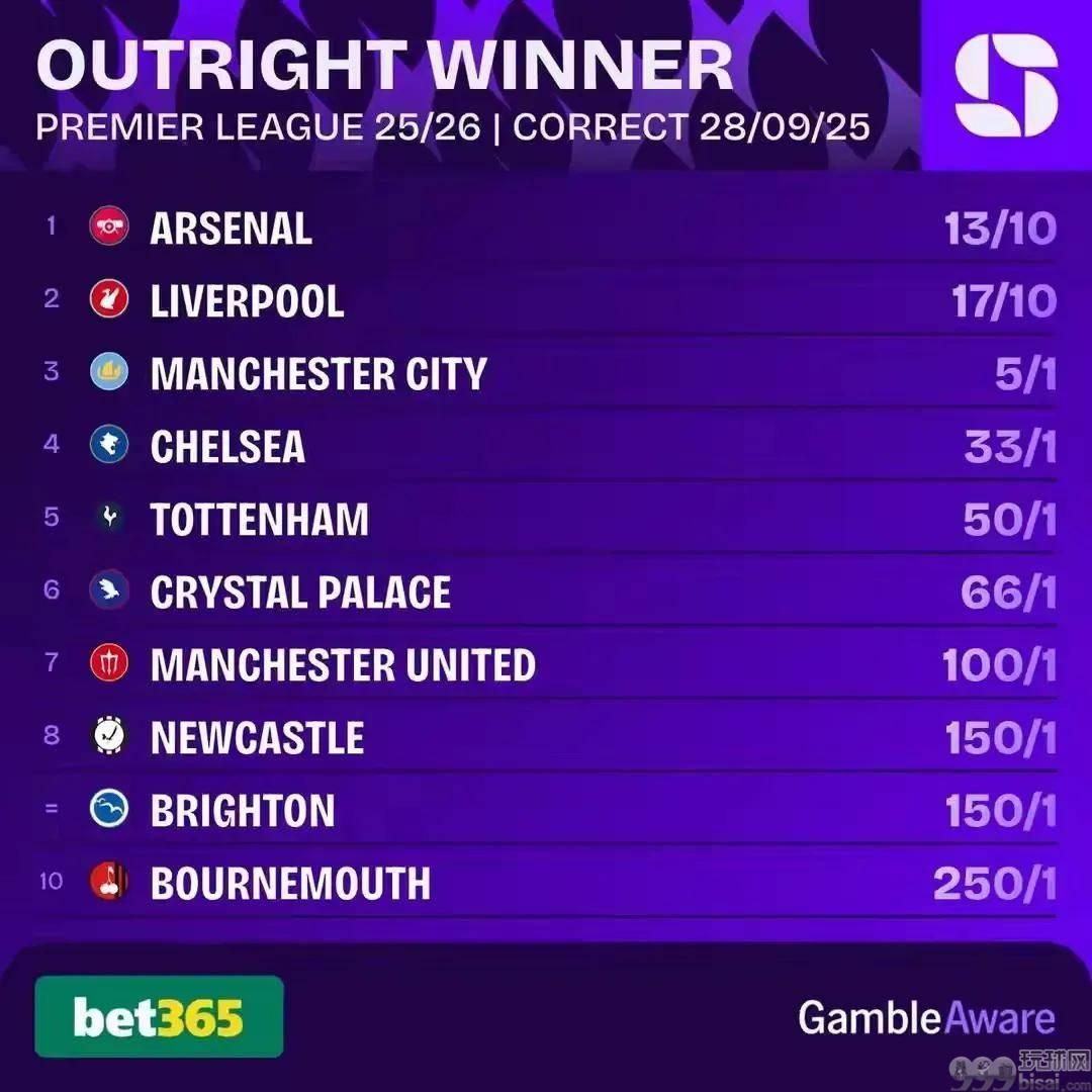 当前位置:主页 > 行业动态 > 2025-26赛季英超冠军概率排行:阿森纳领跑,传统格局面临新挑战
